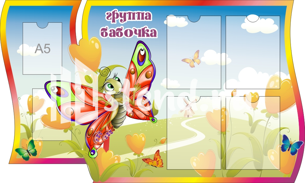 Стенд группа Бабочка 1250х770ммСтенд для детского сада "Уголок логопеда", "наше творчество", "Наша группа"