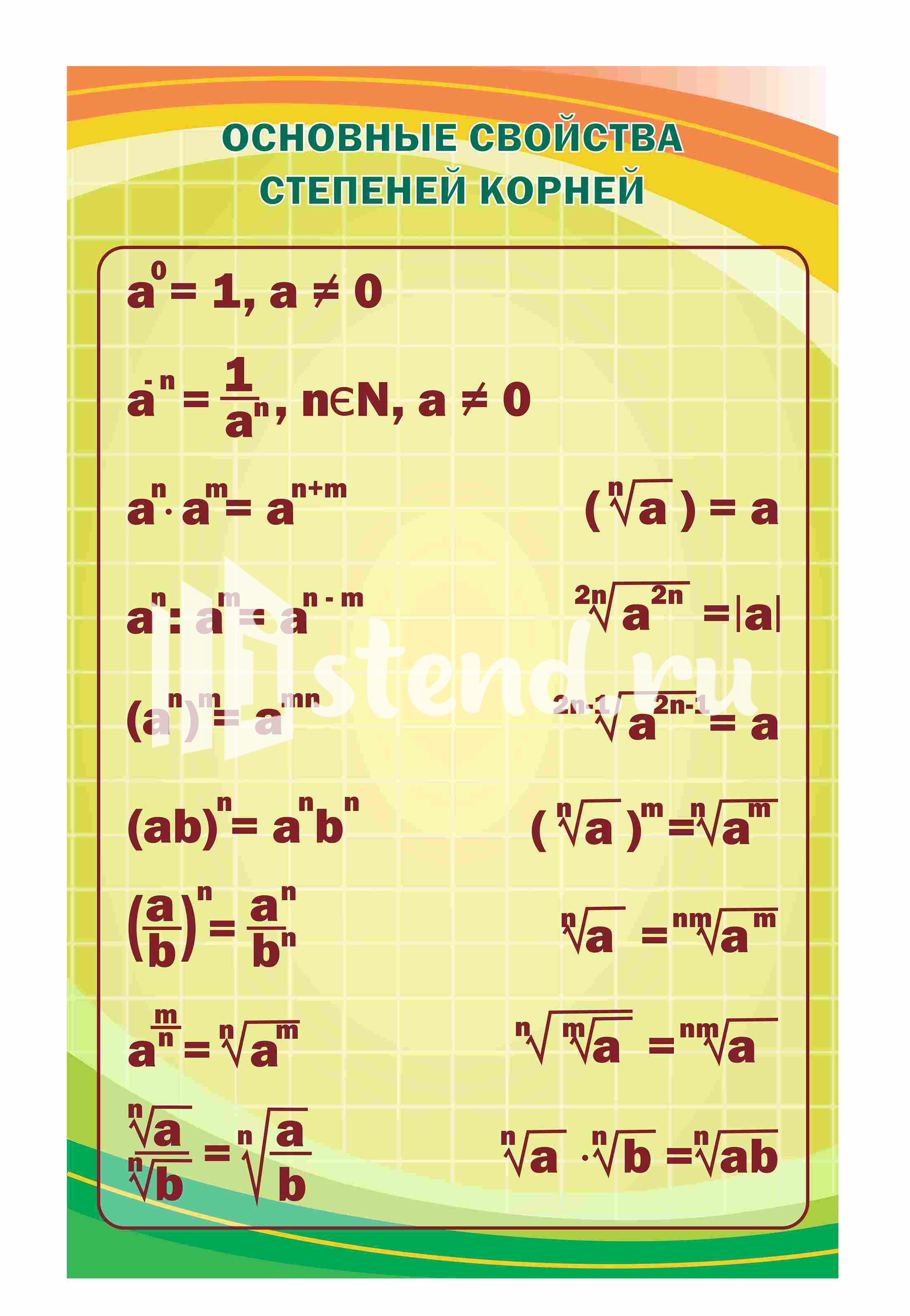 Оформление кабинета Математики Основные свойства степеней корней 700х1100мм