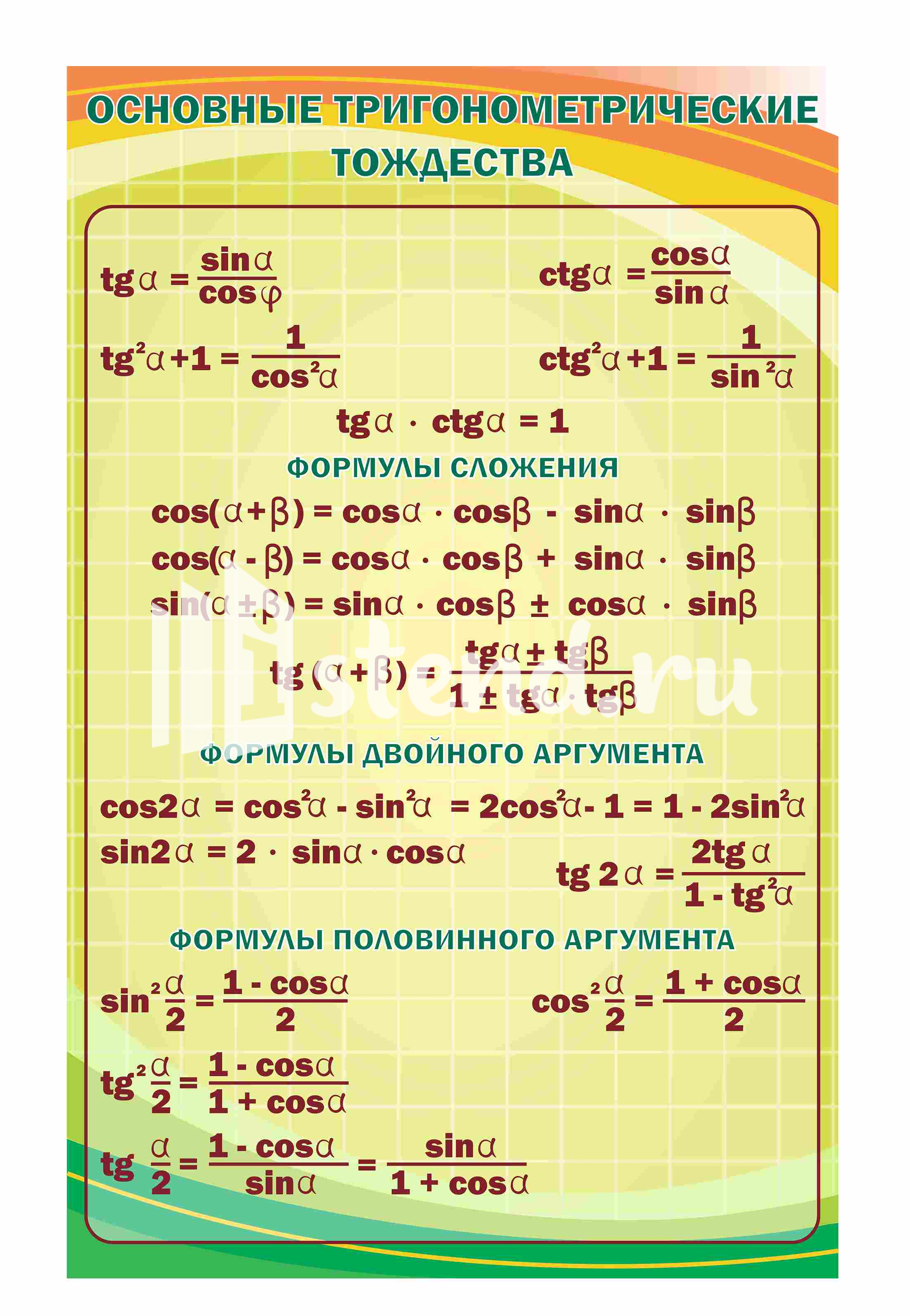 Оформление кабинета Математики Тригонометрические тождества 700х1100мм