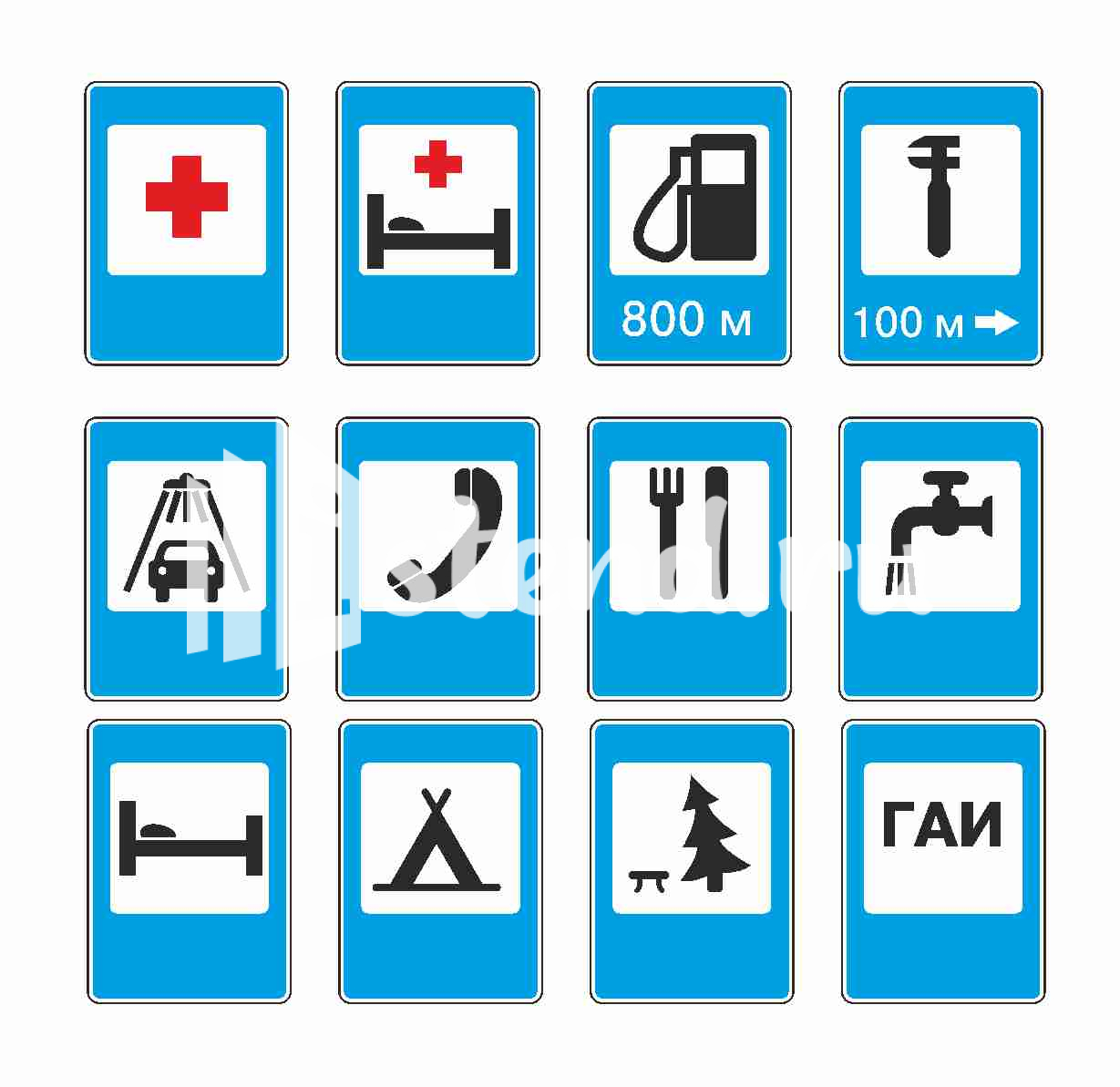 Знаки сервиса информируют о расположении соответствующих объектов. Все дорожные знаки сервиса имеют пояснения, которые описывают действия знаков дорожного движения. Каждый знак сервиса имеет комментарий, поясняющий действие знака дорожного движения в различных ситуациях.